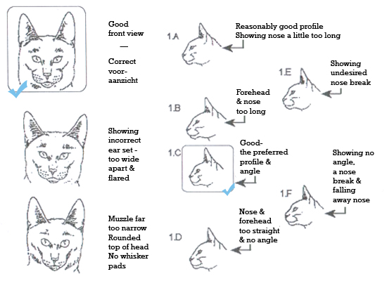 geplaatste oren, amandelvormige groene ogen, gehoekt profiel
